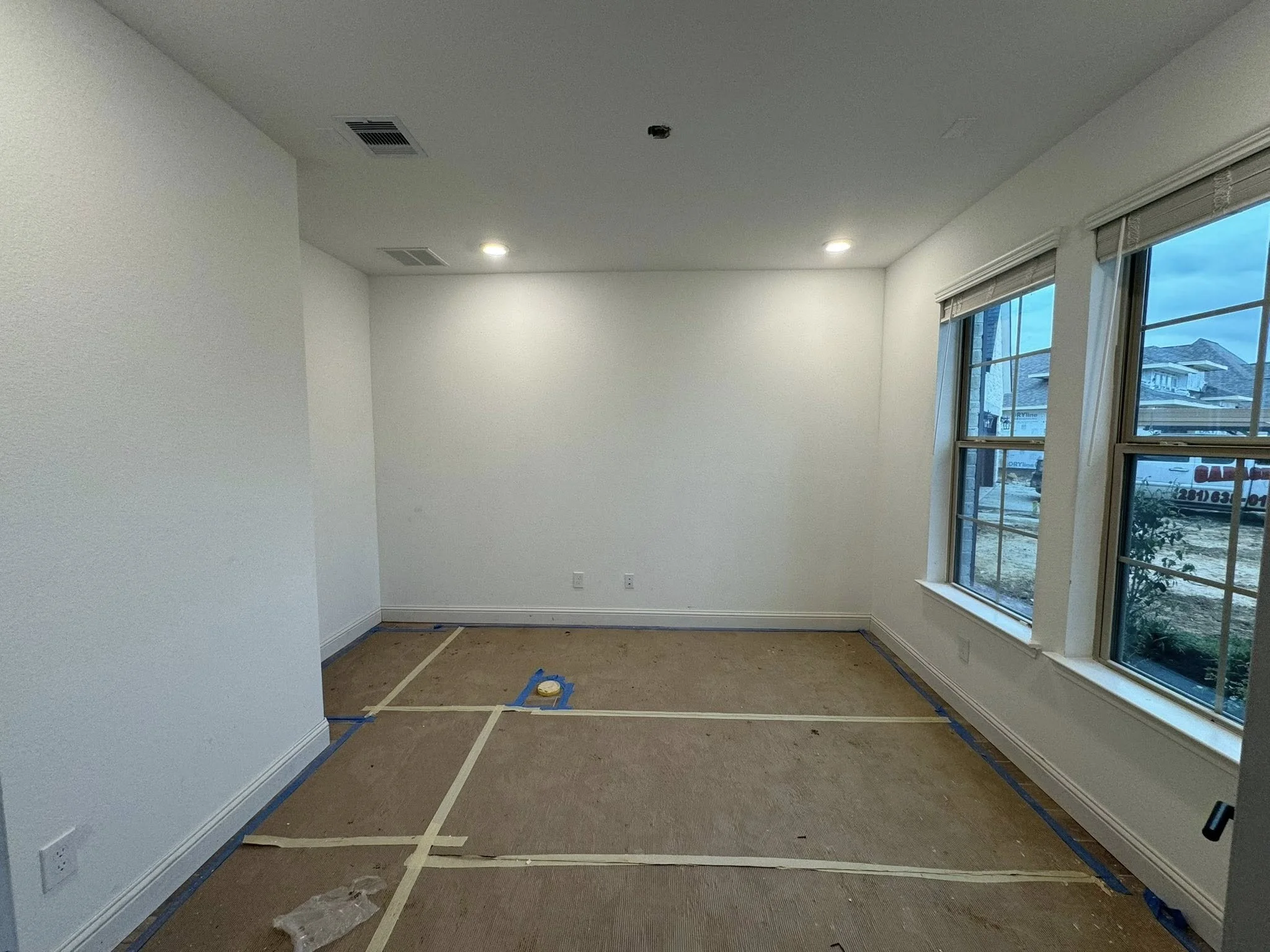 Original office space before the custom build, highlighting room dimensions and layout constraints.
