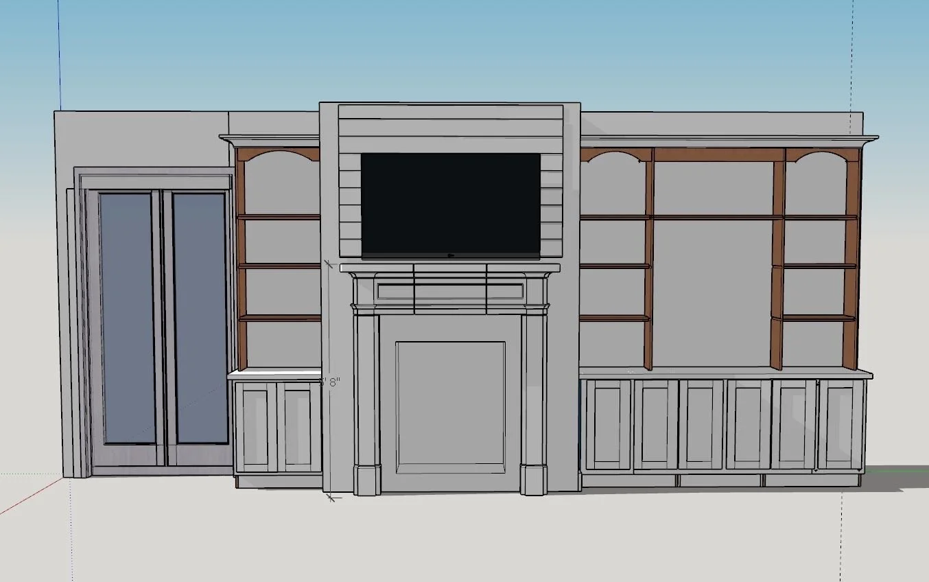 The primary objective was to tailor a design that would integrate seamlessly with the room's dimensions and décor while providing additional storage and display options. The cabinet needed to complement the fireplace, one of the room's focal points, and utilize the available space efficiently without overwhelming it.
